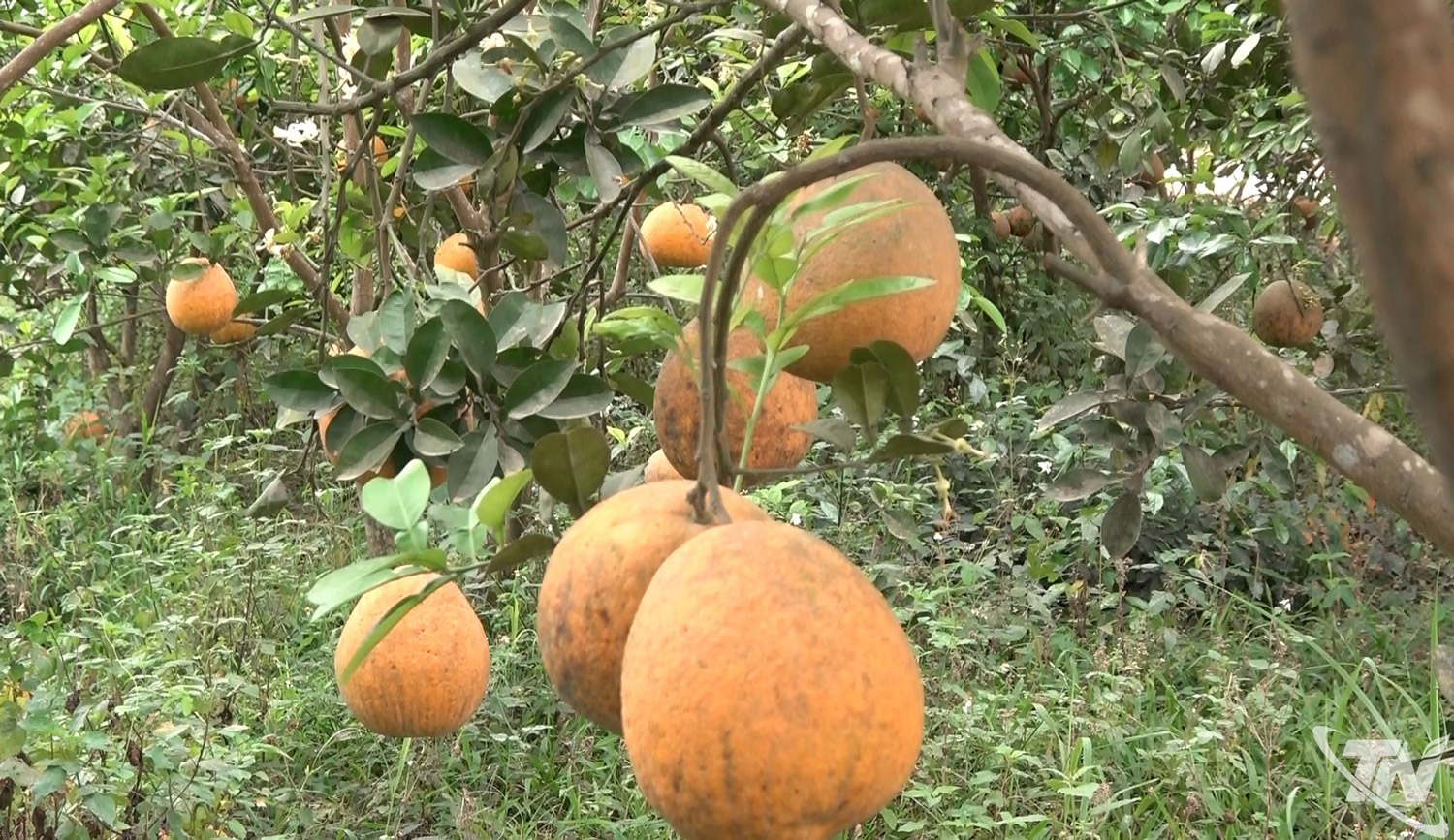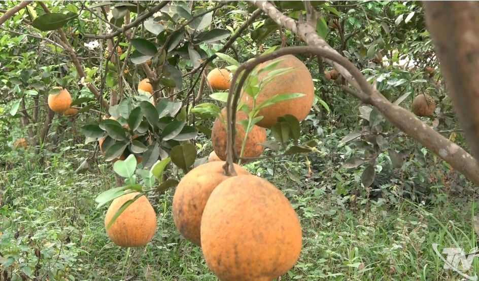 | Nhiều vườn bưởi đã ra hoa, kết trái vụ mới, song quả của vụ trước vẫn còn tồn đọng trên cây, phản ánh rõ khó khăn trong khâu tiêu thụ. |