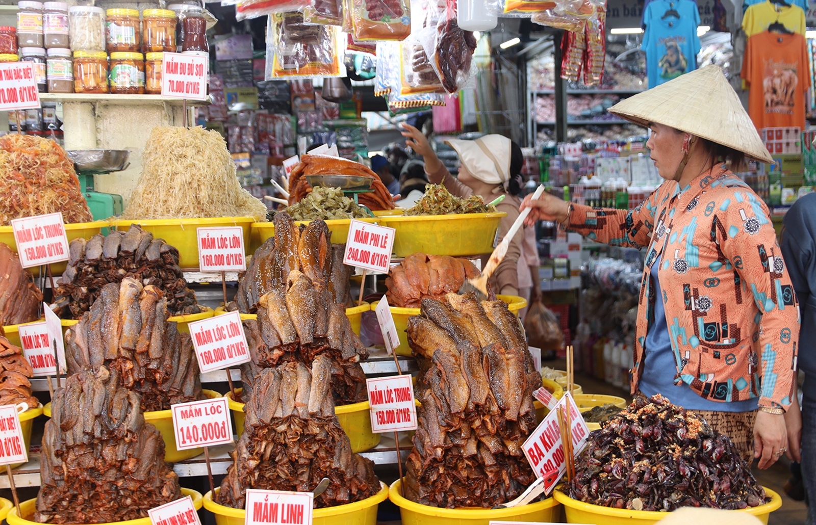 28 tuổi nhưng chị Lê Thị Khánh Vy, ngụ phường Châu Đốc có kinh nghiệm 10 năm gắn bó với nghề mắm của gia đình. “Nhà tôi cung cấp đủ loại mắm, khô, gần như món nào cũng có. Sạp hàng mở cửa bán sáng đêm, vì du khách đến miếu Bà Chúa Xứ núi Sam bất kể giờ giấc. Chúng tôi nương theo đó mà kinh doanh”, chị Vy kể. Gần như tiểu thương nào cũng quen với cảnh phóng viên, du khách đến quay phim, chụp ảnh chợ mắm. Hình ảnh khu chợ càng lan xa, việc kinh doanh của họ càng rộng mở, vì vậy ai nấy chào đón bằng sự niềm nở, chân chất thật lòng.
