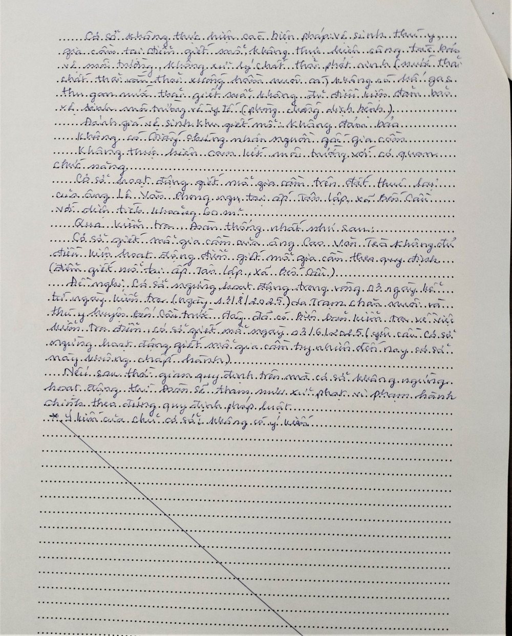 Ngoài ra, ông Tèo và bà Gái cũng không có biện pháp vệ sinh thú y, không có hố gas thu gom nước thải giết mổ, không xử lý chất thải phát sinh, không đủ điều kiện bảo đảm vệ sinh môi trường về y tế phòng chống dịch bệnh, không có giấy chứng nhận nguồn gốc gia cầm, không thực hiện cam kết về vệ sinh môi trường với cơ quan chức năng,... Qua đó, đoàn kiểm tra xác định điểm nuôi nhốt và giết mổ gia cầm của ông Cao Văn Tèo và vợ là bà Huỳnh Thị Gái không đủ điều kiện để hoạt động theo quy định.