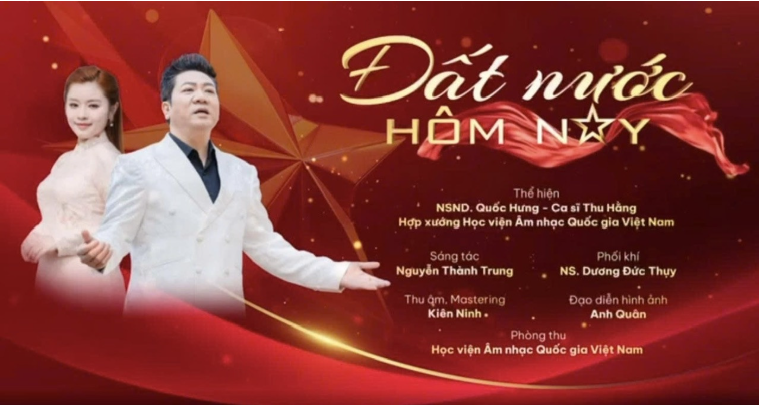 Trường ca “Đất nước hôm nay” của nhạc sĩ Nguyễn Thành Trung, MV ca nhạc do NSND Quốc Hưng, ca sĩ Thu Hằng cùng Hợp xướng Học viện Âm nhạc quốc gia Hà Nội thể hiện; nhạc sĩ Dương Đức Thụy phối khí, được xây dựng như một chỉnh thể nghệ thuật theo tư duy trường ca, đại hợp xướng thế tục hiện đại.