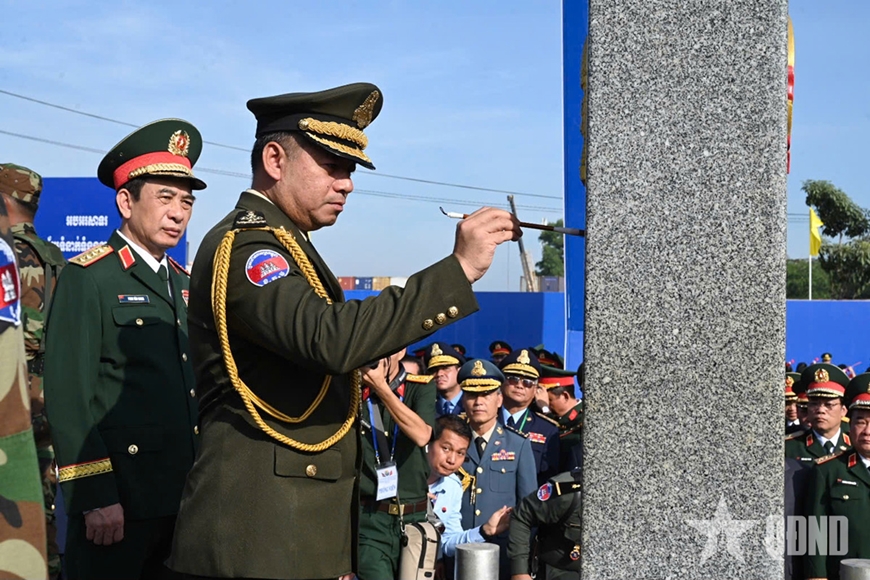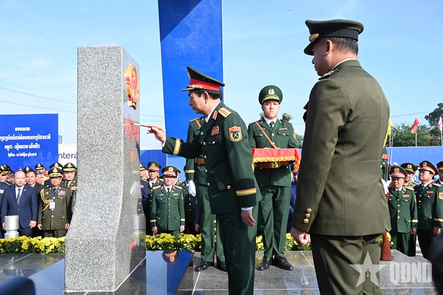 Đại tướng Tea Seiha chứng kiến Đại tướng Phan Văn Giang tô son cột mốc chủ quyền phía Việt Nam. |