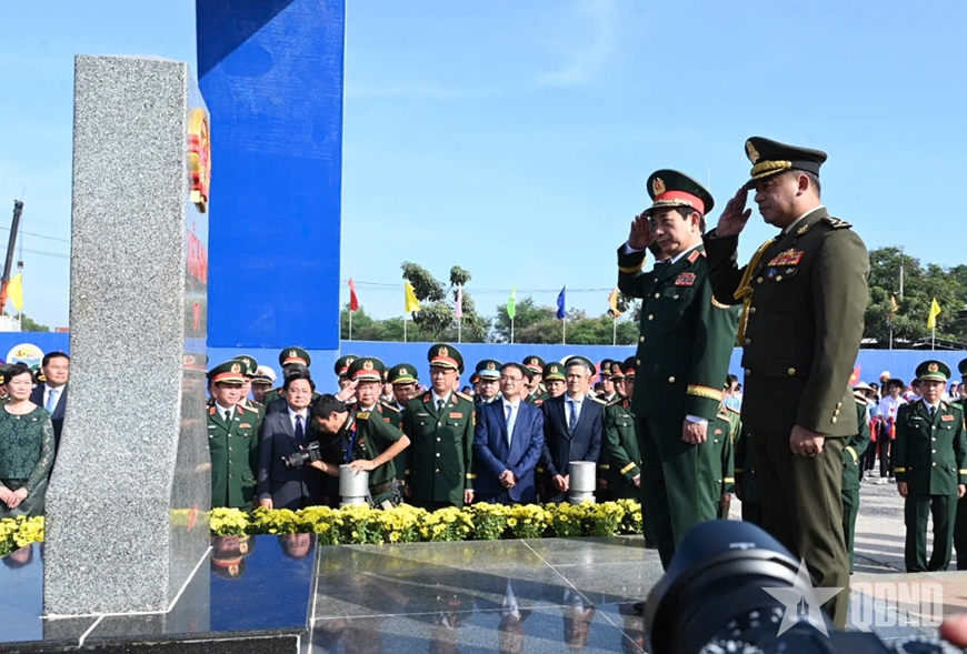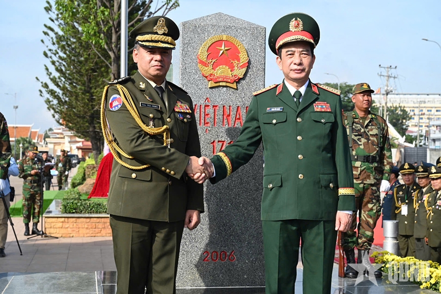 Đại tướng Phan Văn Giang chứng kiến Đại tướng Tea Seiha tô son cột mốc chủ quyền phía Campuchia. |