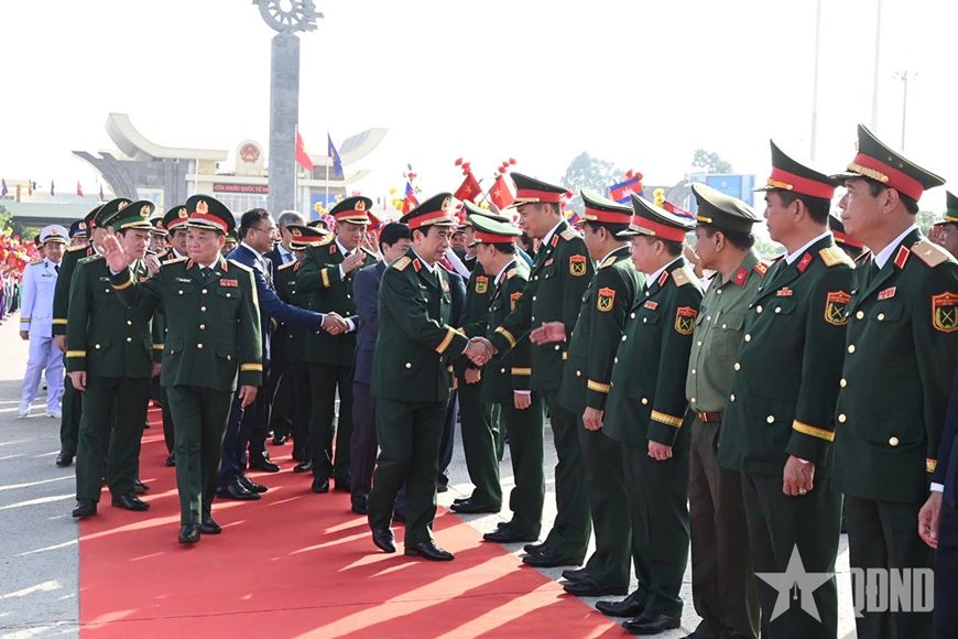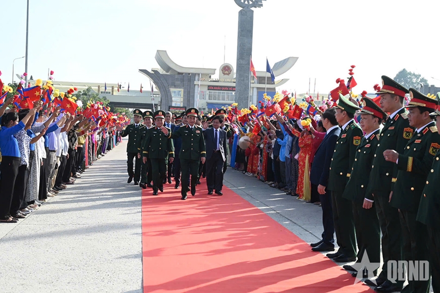 Bộ trưởng Bộ Quốc phòng Campuchia đón Bộ trưởng Bộ Quốc phòng Việt Nam tại cửa khẩu quốc tế Bavet. |