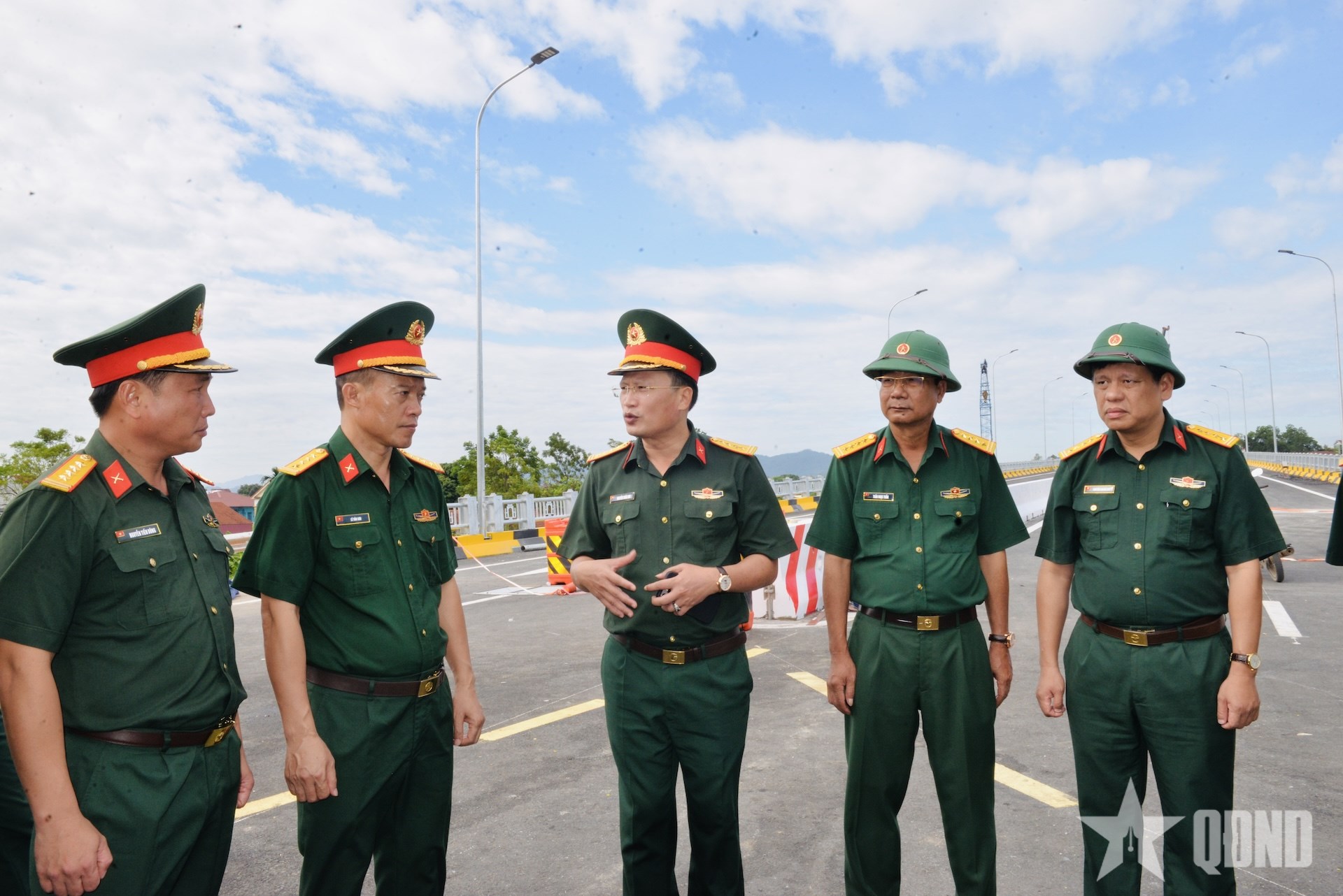| Đại tá Lê Văn Sơn, Phó tham mưu trưởng Quân khu 2 (thứ 2, từ trái sang); Đại tá Nguyễn Tuấn Anh, Phó tư lệnh Binh đoàn 12, Phó tổng giám đốc Tổng công ty Xây dựng Trường Sơn (đứng giữa) kiểm tra, triển khai công tác tổ chức cho lễ khánh thành, thông xe cầu Phong Châu vào ngày 28-9. |