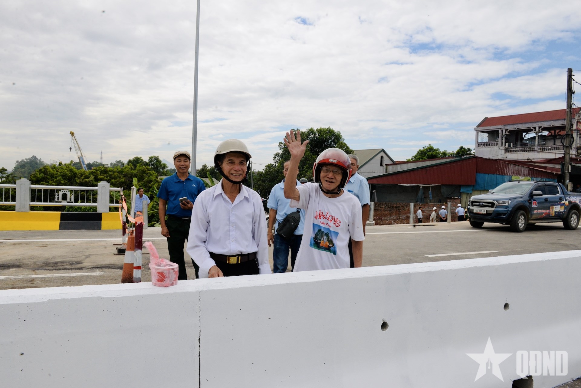 | Vượt quãng đường hơn 40km, bác Tạ Quang Tĩnh (thứ 3, từ trái sang) và Nguyễn Văn Kiệm (thứ 2, từ phải sang), xã Cẩm Khê đã 12 lần tới tham quan cầu và cập nhật tiến độ của cầu Phong Châu. |