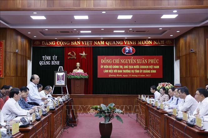 Tiếp tục chương trình công tác tại Quảng Bình, sáng nay, 15-6, Chủ tịch nước Nguyễn Xuân Phúc chủ trì buổi làm việc với Thường vụ Tỉnh ủy Quảng Bình. Cùng dự buổi làm việc có Bí thư Trung ương Đảng, Trưởng Ban Tuyên giáo Trung ương Nguyễn Trọng Nghĩa; lãnh đạo một số bộ, ngành.