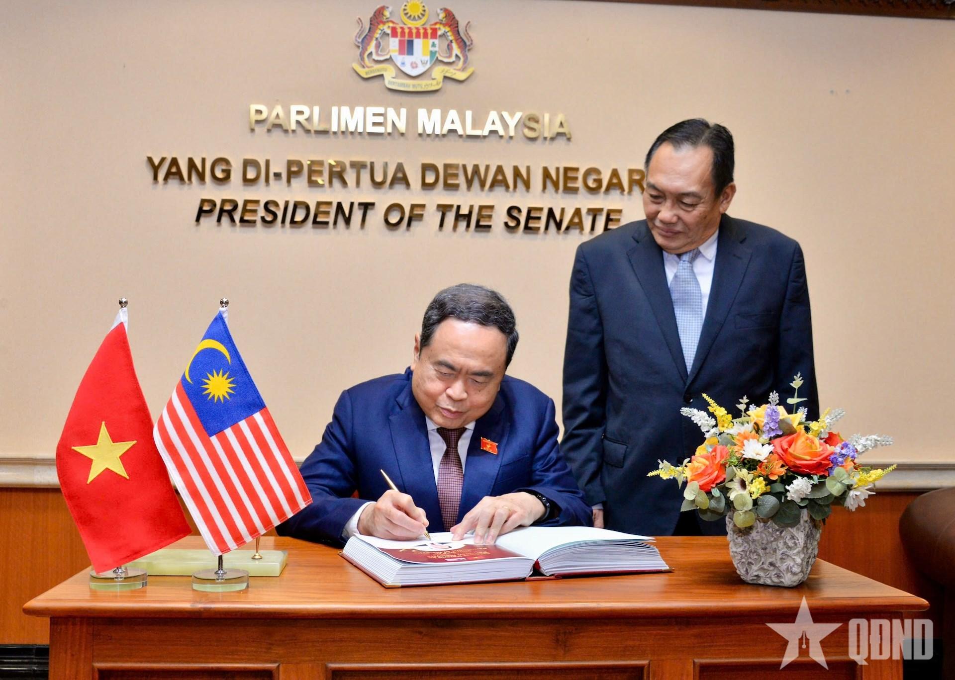 | Chủ tịch Quốc hội Trần Thanh Mẫn ghi sổ lưu niệm tại trụ sở Thượng viện Malaysia. |