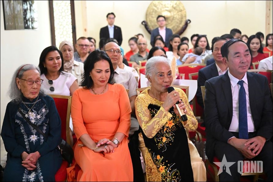 | Bà Trần Hồng Mây (cầm micro), thế hệ những người đầu tiên sang sinh sống tại Morocco bày tỏ xúc động khi được gặp Chủ tịch Quốc hội và phu nhân cùng đoàn đại biểu cấp cao Việt Nam. |