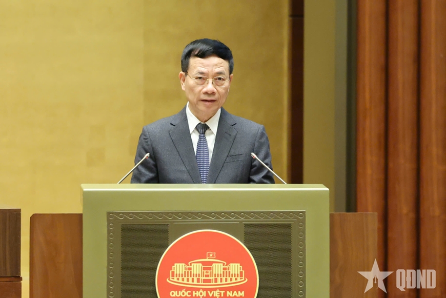 Bộ trưởng Bộ Khoa học và Công nghệ Nguyễn Mạnh Hùng trình bày tờ trình dự án Luật Trí tuệ nhân tạo. Ảnh: TRỌNG HẢI |
