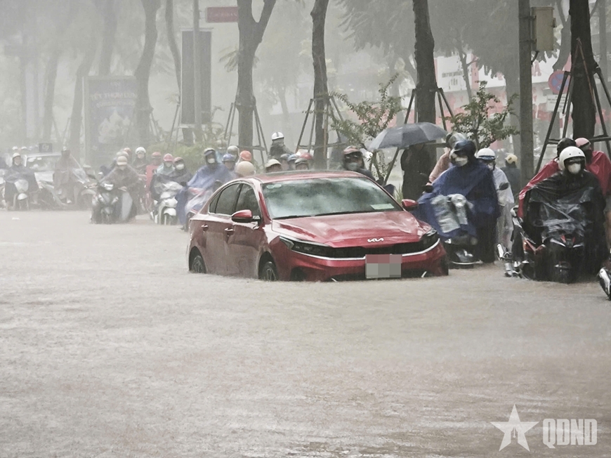 Tình trạng mưa lớn liên tục đêm ngày 25-8 và kéo dài tới ngày 26-8 đã gây ra tình trạng ngập úng ở nhiều tuyến đường phố Hà Nội. Ảnh: PHẠM HƯNG |