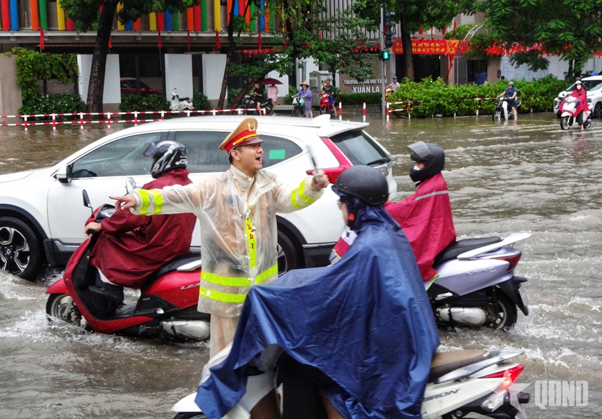 | Lực lượng Cảnh sát giao thông đã có mặt từ sớm để phân luồng ở những điểm ngập gây tắc đường. Ảnh: PHẠM HƯNG |