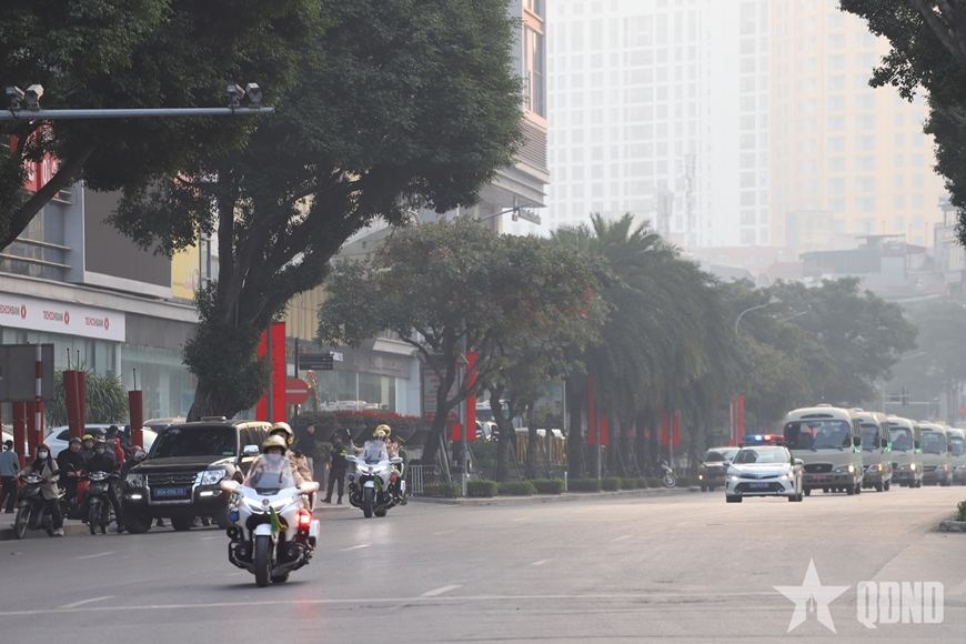| Đoàn xe di chuyển qua Trung tâm Hội nghị Quốc gia (đường Phạm Hùng). |