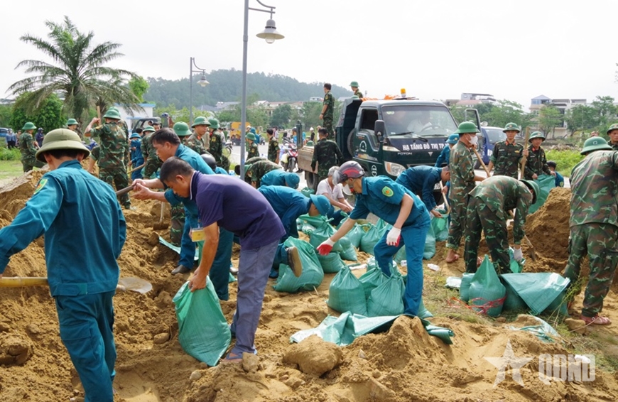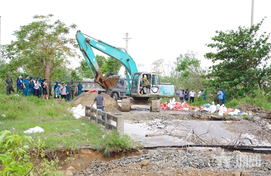 Tại hiện trường, hàng trăm người dân cùng nhiều phương tiện đã được huy động, khẩn trương vận chuyển đất đá, bê tông, bao tải cát… để khắc phục sự cố. Lực lượng chức năng, bộ đội và dân quân chia thành nhiều tổ, tập trung xử lý điểm vỡ, nỗ lực ngăn nước tràn vào khu dân cư.