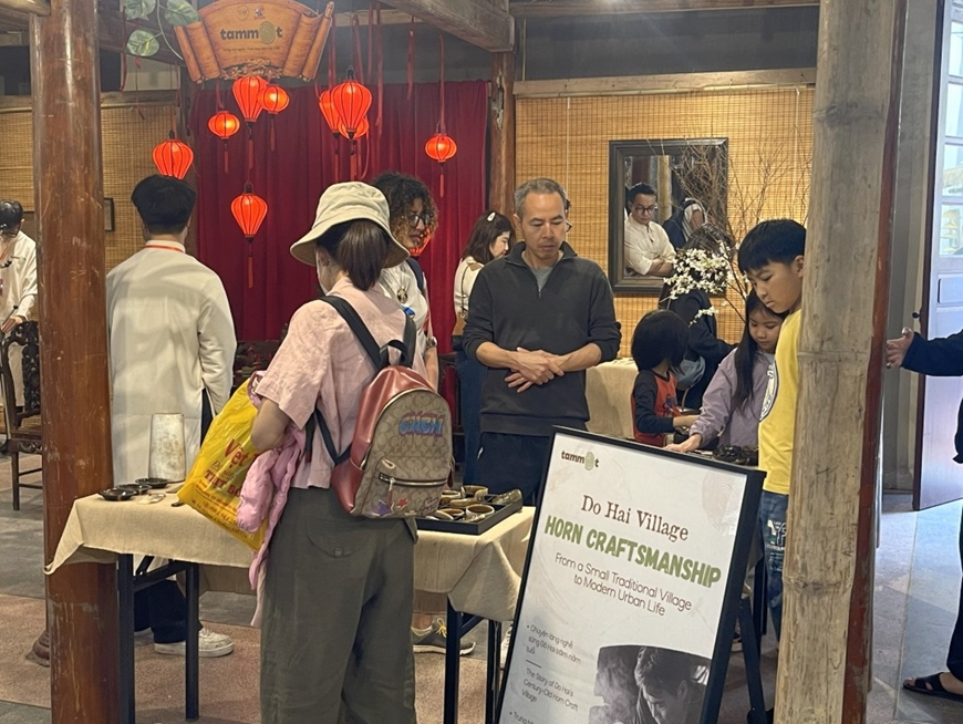 | Khách hàng trong và ngoài nước tại gian hàng của làng nghề sừng mỹ nghệ Đô Hai ở số 22 Hàng Buồm (Hà Nội). |