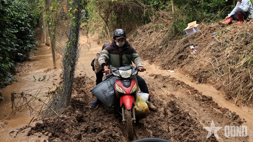 Người dân địa phương mở đường tạm băng qua khu vực sạt lở trên đèo D'ran để vận chuyển nông sản và đi lại.