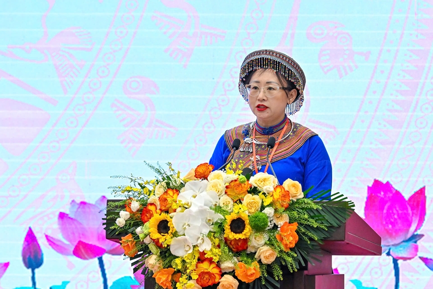 Đại biểu Giàng Thị Dung, Phó bí thư Tỉnh ủy, Chủ tịch Ủy ban Mặt trận Tổ quốc Việt Nam tỉnh Lào Cai phát biểu tại hội nghị. |