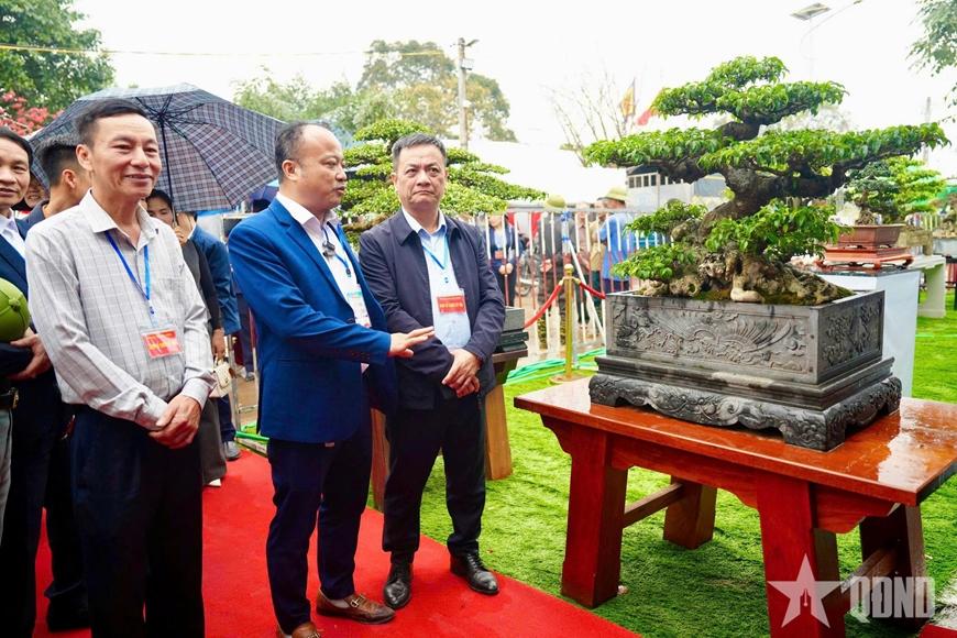 Các đại biểu và du khách tham quan những tác phẩm bonsai đặc sắc được mang tới từ nhiều tỉnh, thành phố phía Bắc trưng bày tại triển lãm.