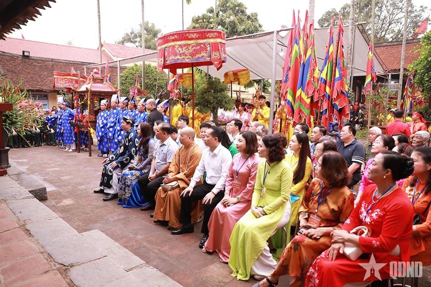 Từ sáng sớm, không gian đình làng cổ kính như được đánh thức bởi tiếng trống chiêng, cờ hội rợp lối, dòng người nô nức về dâng hương tưởng nhớ các bậc tiền nhân.