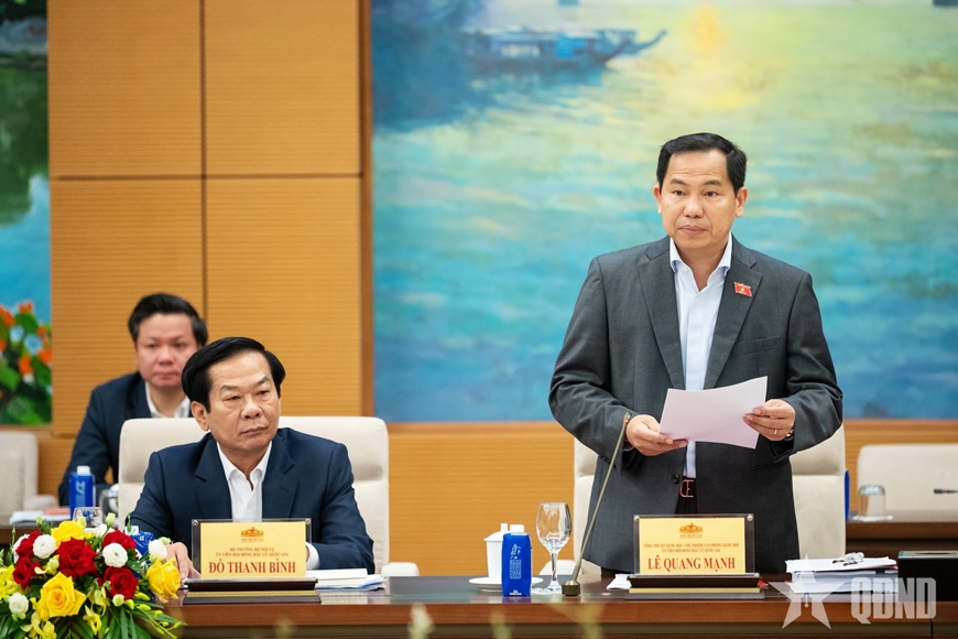 Ủy viên Trung ương Đảng, Tổng Thư ký Quốc hội, Chủ nhiệm Văn phòng Quốc hội, Chánh Văn phòng Hội đồng Bầu cử quốc gia Lê Quang Mạnh báo cáo tại hội nghị.