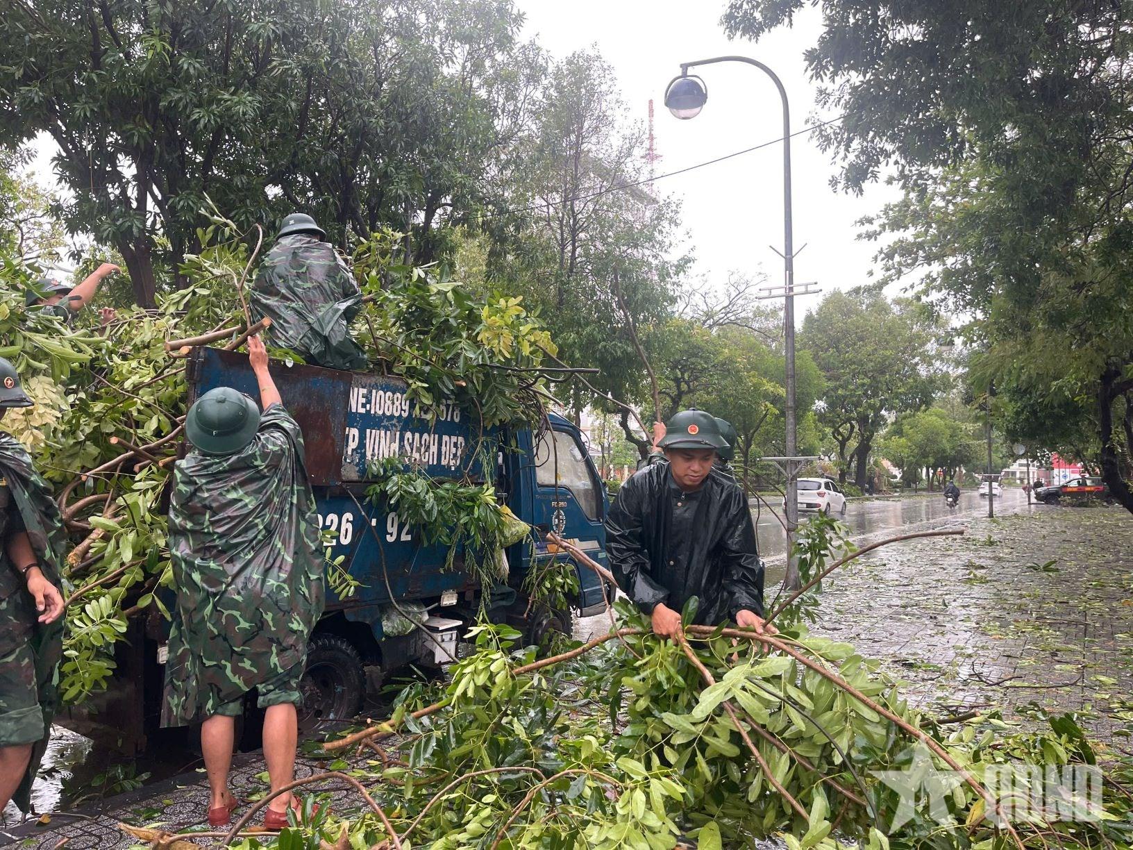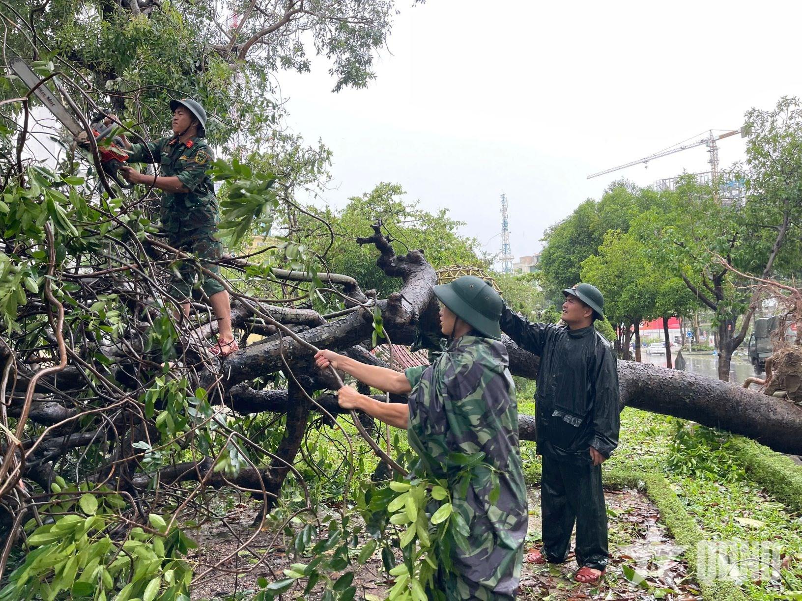Bộ CHQS tỉnh Nghệ An đã huy động hơn 100 cán bộ, chiến sĩ dọn dẹp các công trình công cộng trọng điểm hư hỏng nặng, hỗ trợ giải phóng các tuyến đường ách tắc cây cối ngã đổ.