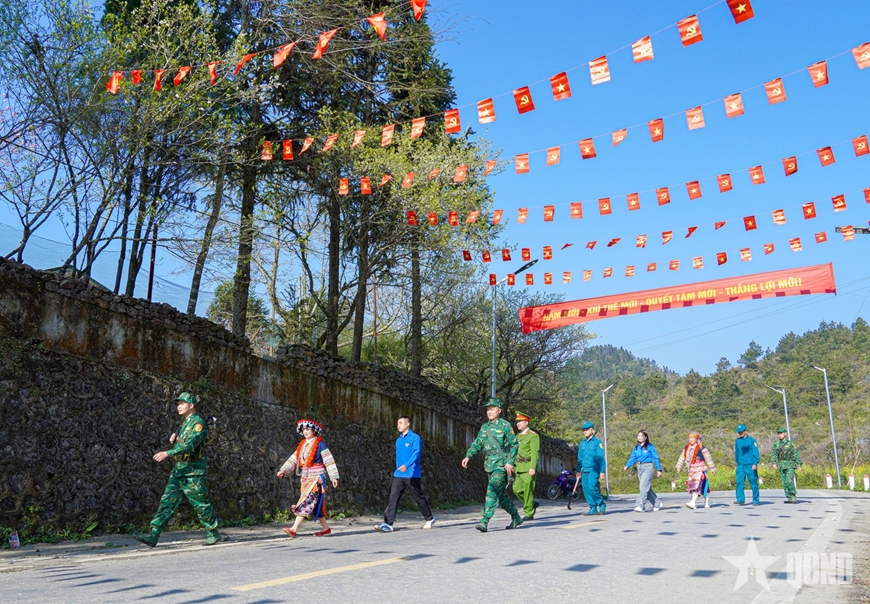 Ở vùng biên, nơi nhiều thôn bản còn xa trung tâm, việc tiếp cận thông tin của người dân vẫn còn hạn chế. Vì vậy, những người lính biên phòng không chỉ làm nhiệm vụ bảo vệ chủ quyền, giữ gìn an ninh biên giới mà còn trở thành những “tuyên truyền viên đặc biệt”, mang thông tin về ngày hội lớn của đất nước đến với bà con.