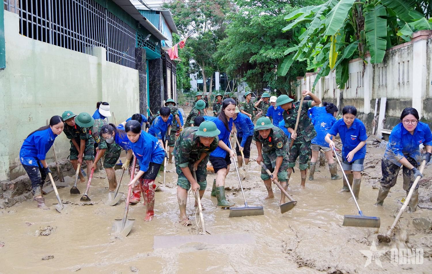 | LLVT phối hợp với đoàn viên, thanh niên địa phương giúp nhân dân xã Con Cuông khắc phục hậu quả sau mưa lũ. |