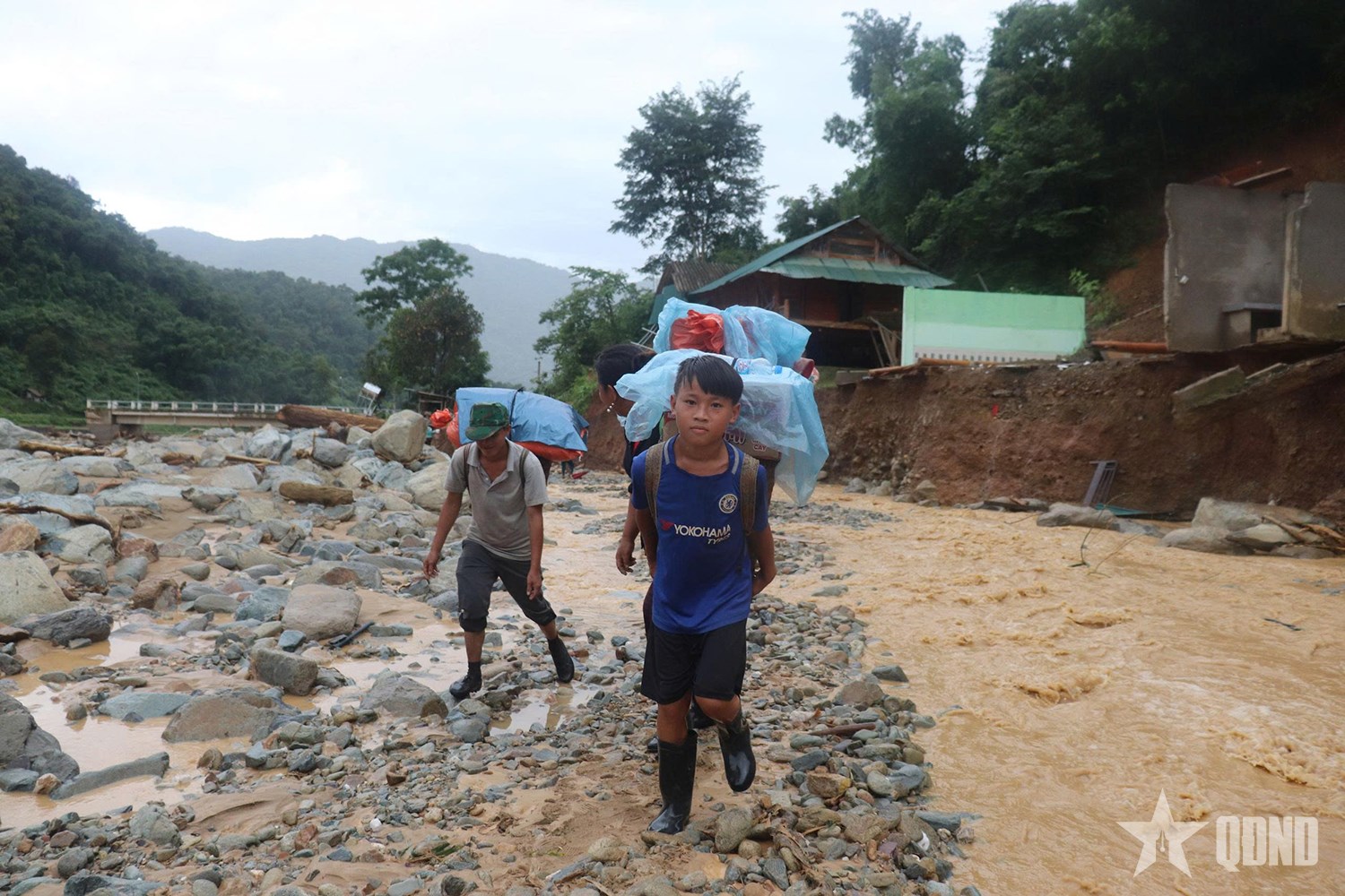 Chính quyền địa phương và các đơn vị LLVT vẫn miệt mài bám địa bàn, dốc toàn lực cùng bà con khắc phục hậu quả. Đường bộ bị chia cắt, họ không quản ngại gian nan, lội suối, băng rừng, đi bộ hàng chục cây số, có nơi phải dùng thuyền máy ngược dòng nước xiết mang theo từng bao gạo, thùng mì ăn liền, chai nước để tiếp sức cho bà con vực dậy sau thiên tai.