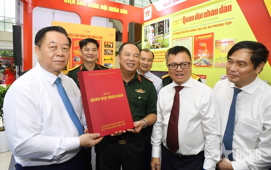 Đồng chí Nguyễn Trọng Nghĩa, Ủy viên Bộ Chính trị, Bí thư Trung ương Đảng, Trưởng ban Tuyên giáo và Dân vận Trung ương cùng các đại biểu tham quan gian trưng bày của Khối báo chí Quân đội tại Hội Báo toàn quốc 2025. Ảnh: TUẤN HUY |