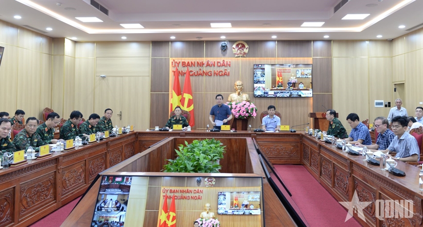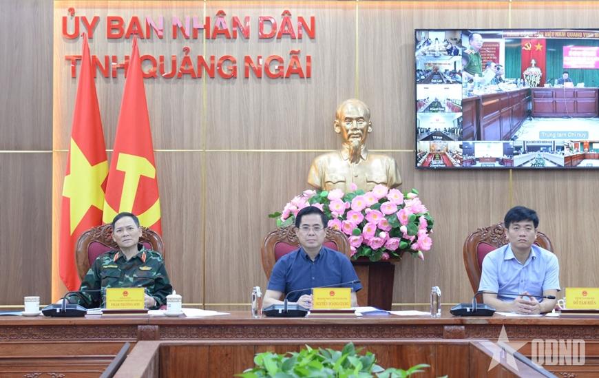Thượng tướng Phạm Trường Sơn, Phó tổng Tham mưu trưởng Quân đội nhân dân Việt Nam (trái) dự hội nghị trực tuyến tại điểm cầu UBND tỉnh Quảng Ngãi. |