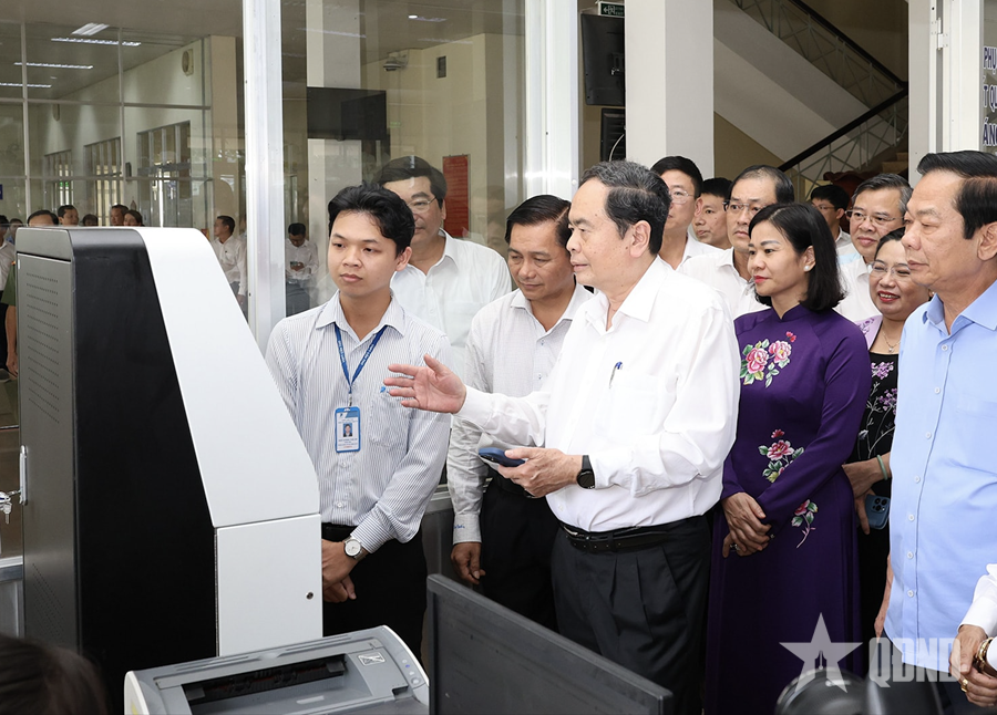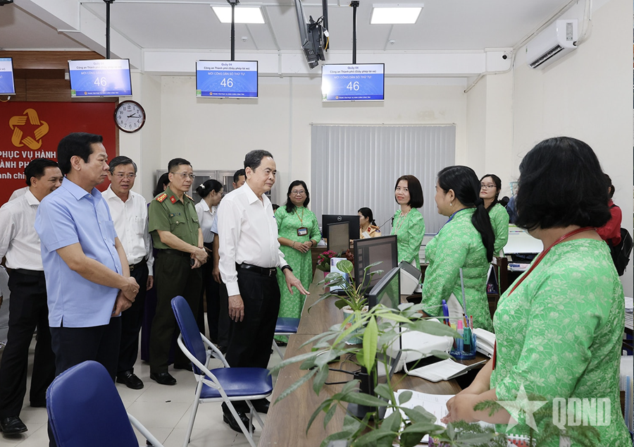 Chủ tịch Quốc hội Trần Thanh Mẫn khảo sát thực tế tại Trung tâm phục vụ hành chính công phường Ninh Kiều (TP Cần Thơ), ngày 30-6-2025. Ảnh: HẢI HÀNH |