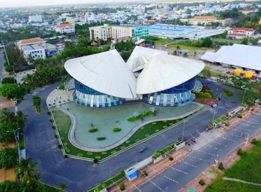 Nhà hát Cao Văn Lầu được xây dựng và hoàn thành vào năm 2014 theo mô hình 3 chiếc nón lá đan xen nhau có diện tích 1800 m2, có 3 tầng với các độ cao giảm dần gắn liền với đời sống sinh hoạt và lao động của người phụ nữ Nam Bộ. Chiếc nón lá là biểu tượng của văn hóa phương Nam. Ba khối nhà hình nón lá được đặt bên cạnh hồ, giữa hồ là lối đi cho khách tham quan uốn cong theo suốt chiều dài hồ. Phần diện tích hồ phía ngoài lối đi dùng để trồng sen, súng. Phần hồ nước bên trong in hình ảnh của mái 3 nón lá lung linh trên sóng nước.