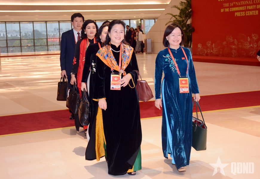 Các đại biểu tiến vào hội trường thực hiện chương trình ngày làm việc thứ ba, Đại hội XIV của Đảng.