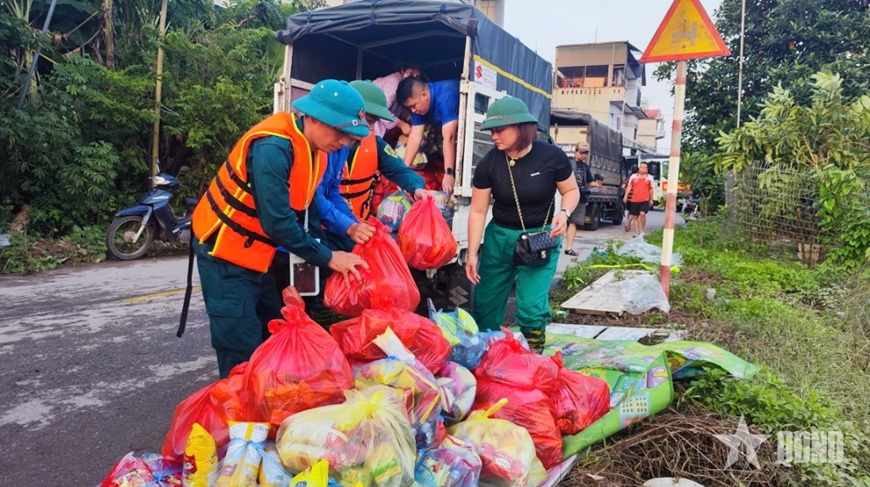 Lực lượng dân quân tự vệ xã Hồng Vân, tỉnh Bắc Ninh vận chuyển thực phẩm cứu trợ các hộ dân bị nước lũ cô lập. Ảnh: SƠN NAM |