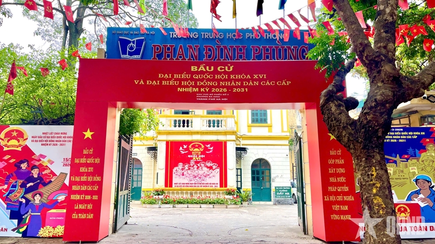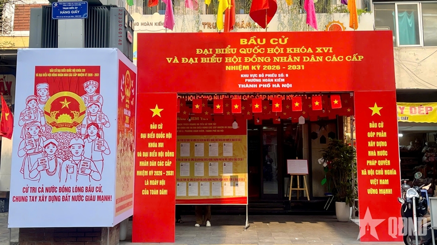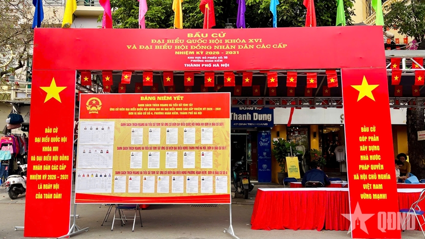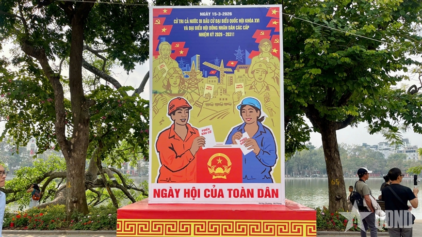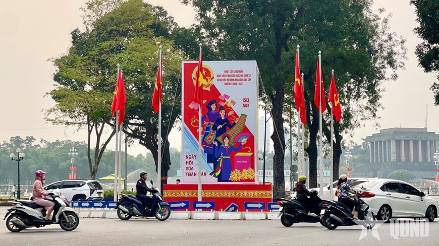 Phố phường Thủ đô rực rỡ cờ hoa, pano tuyên truyền cỡ lớn với màu sắc tươi sáng, nội dung về cuộc bầu cử đại biểu Quốc hội khóa XVI và đại biểu HĐND các cấp nhiệm kỳ 2026-2031. |