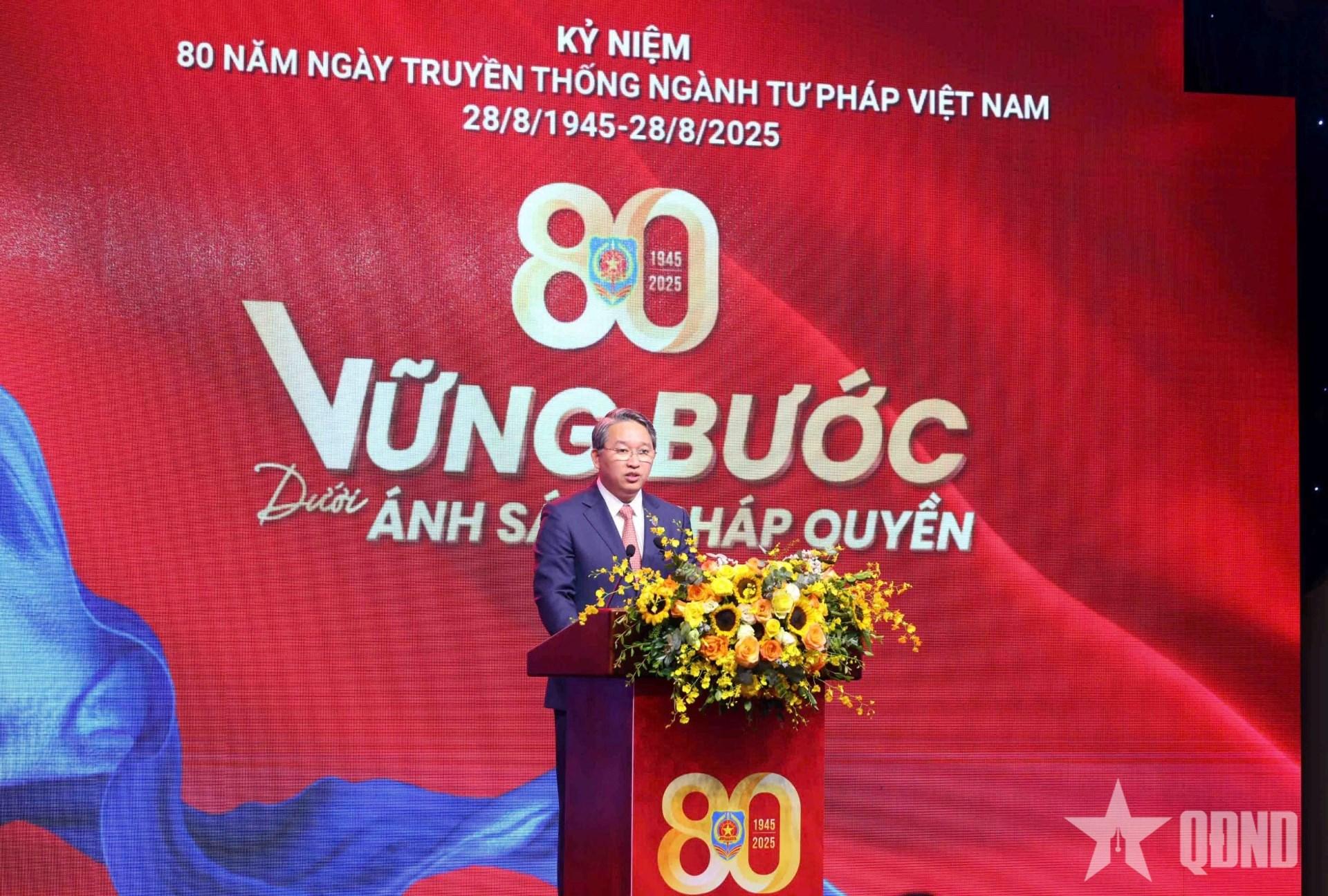 * Trước đó, phát biểu tại buổi lễ, Bộ trưởng Bộ Tư pháp Nguyễn Hải Ninh ôn lại chặng đường 80 năm của Bộ, ngành Tư pháp với nhiều thử thách, thăng trầm nhưng cũng rất đỗi vẻ vang, xứng đáng với lời khẳng định của Chủ tịch Hồ Chí Minh: “Tư pháp là một cơ quan trọng yếu của chính quyền”.