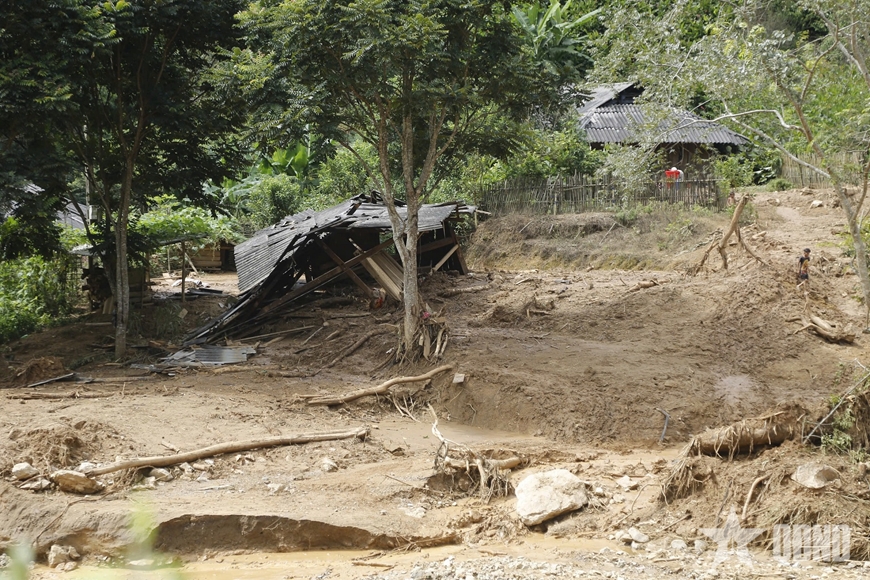 | Nhiều ngôi nhà tại bản Háng Pu Xi, xã Xa Dung bị sập đổ sau đêm lũ quét. |