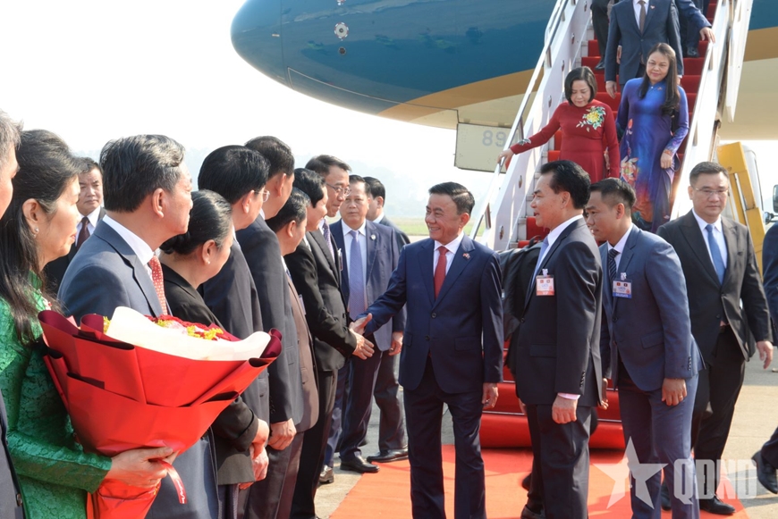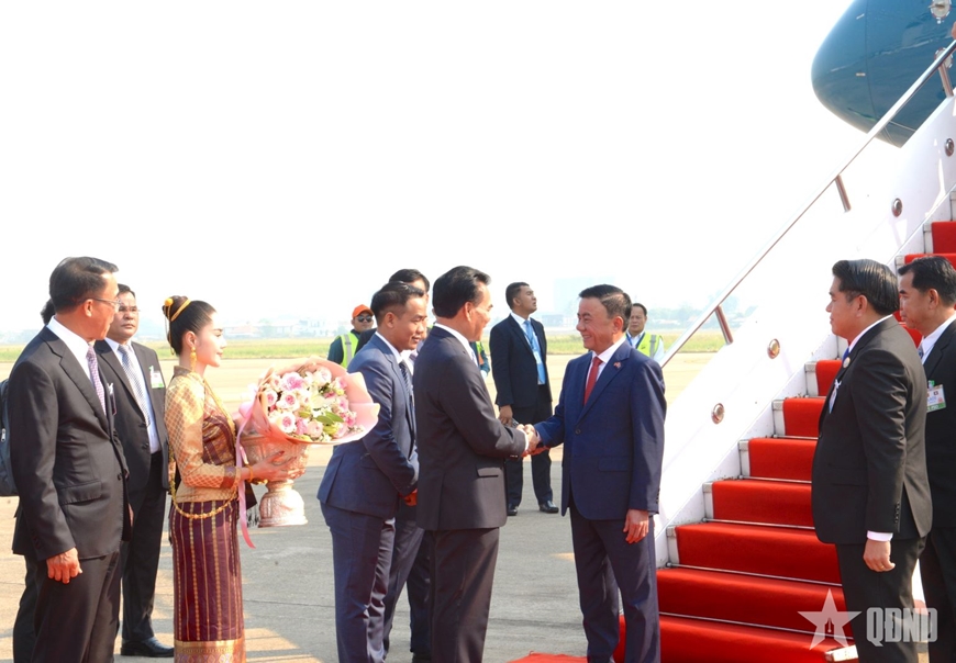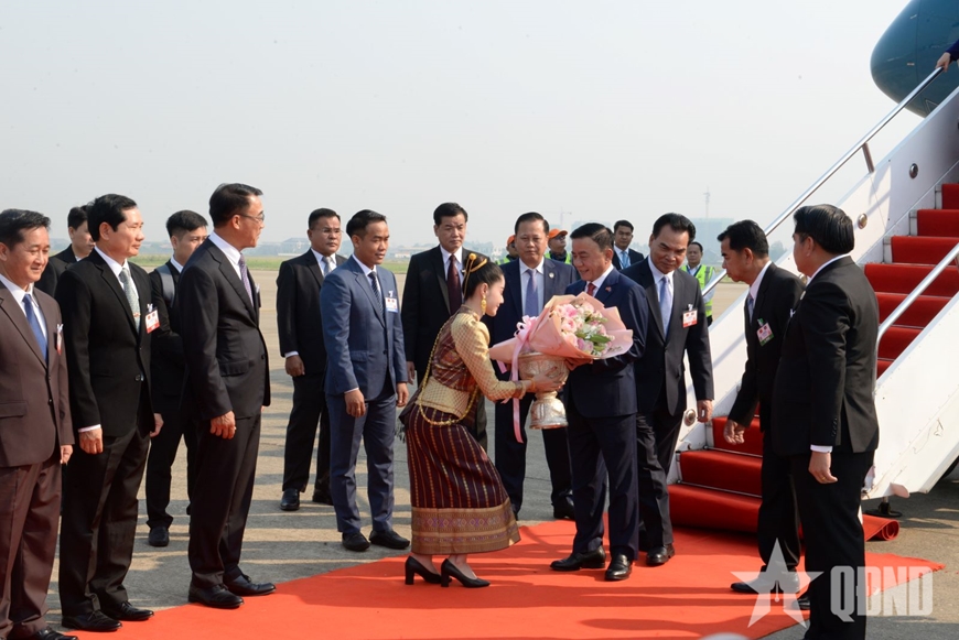 Đón Thường trực Ban Bí thư và đoàn đại biểu cấp cao Việt Nam tại sân bay, về phía Lào có các đồng chí: Phet Phomphiphak, Ủy viên Bộ Chính trị, Chánh Văn phòng Trung ương Đảng; Bounleua Phandanouvong, Ủy viên Trung ương Đảng, Trưởng ban Đối ngoại Trung ương.