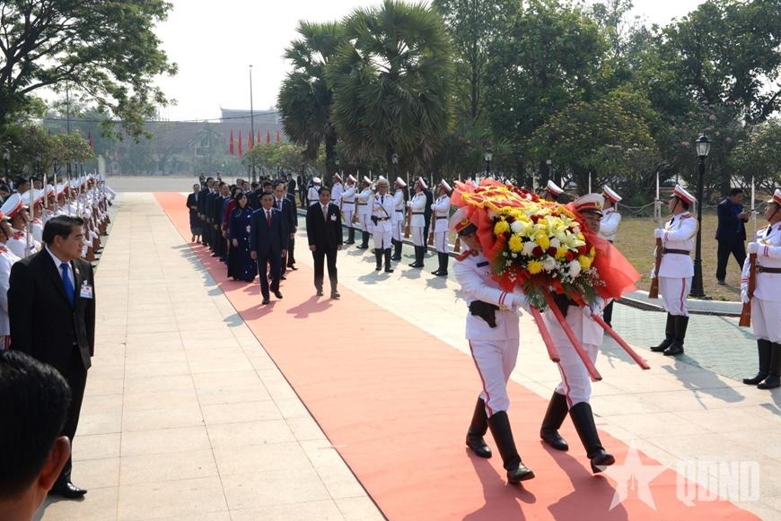 Đón và tháp tùng tại Đài tưởng niệm, về phía Lào có đồng chí Athsaphangthong Siphandone, Ủy viên Trung ương Đảng, Chủ tịch Chính quyền Thủ đô Vientian.