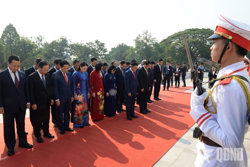 Thường trực Ban Bí thư Trần Cẩm Tú cùng đoàn đại biểu cấp cao Việt Nam dâng hoa tại Đài tưởng niệm các chiến sĩ vô danh. |