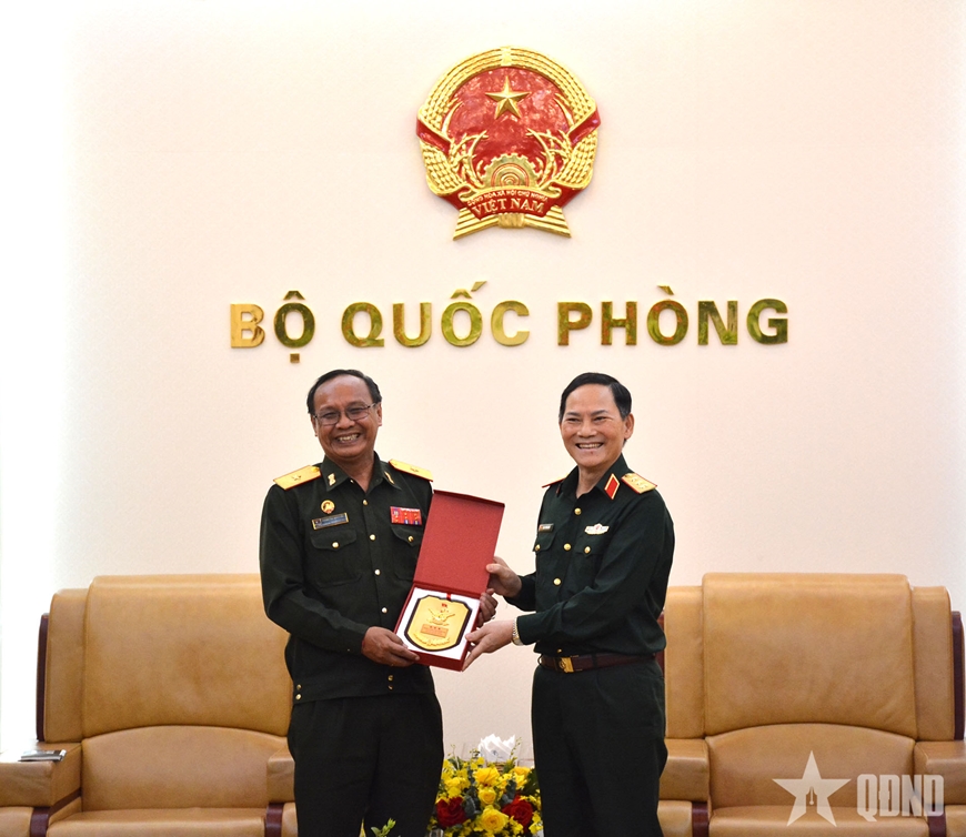 Thượng tướng Phạm Trường Sơn trao quà lưu niệm tặng Thiếu tướng Thongsamay Soukpasot. |
