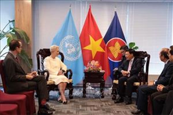 Phó thủ tướng Thường trực Chính phủ Phạm Bình Minh tiếp Đại sứ Hoa Kỳ tại Tổ chức Lương thực và Nông nghiệp của Liên hợp quốc (FAO) Cindy McCain. Ảnh: TTXVN |