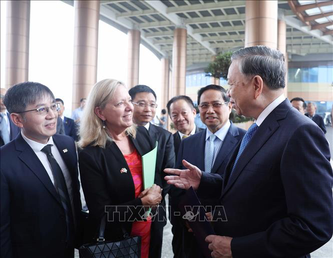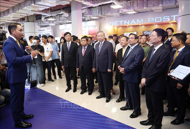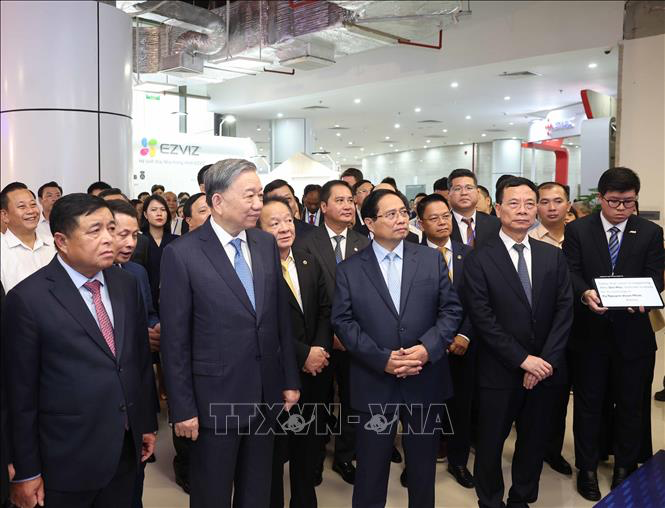 Tổng Bí thư Tô Lâm, Thủ tướng Phạm Minh Chính và các đại biểu tham quan các gian trưng bày sản phẩm công nghệ tại triển lãm. |