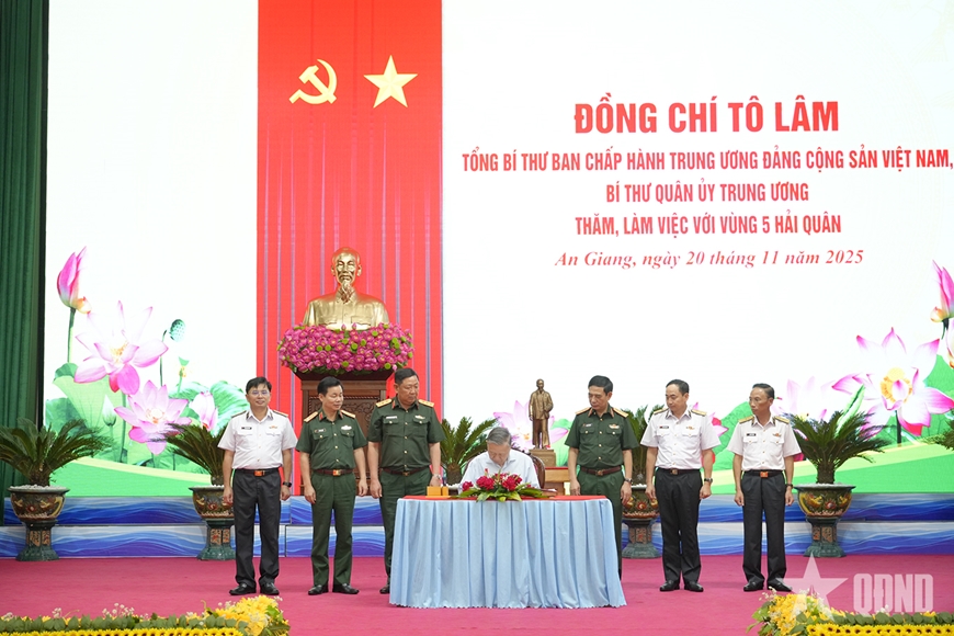 Trong chuyến thăm và làm việc tại Vùng 5 Hải quân, Tổng Bí thư Tô Lâm gửi lời thăm hỏi, chúc mừng tới cán bộ, chiến sĩ Hải quân nhân dân Việt Nam và khẳng định Hải quân là lực lượng nòng cốt bảo vệ chủ quyền biển đảo của Tổ quốc. Trải qua hơn 70 năm xây dựng và trưởng thành, dưới sự lãnh đạo của Đảng, Nhà nước và Quân ủy Trung ương, Bộ Quốc phòng, Quân chủng Hải quân đã không ngừng lớn mạnh, lập nhiều chiến công, đóng góp quan trọng vào sự nghiệp bảo vệ Tổ quốc.