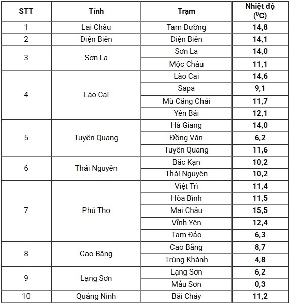 Nhiệt độ thấp nhất trong đợt không khí lạnh này ở khu vực Bắc Bộ và Thanh Hóa, phổ biến ở mức 10-12 độ C, riêng vùng núi 6-9 độ C, vùng núi cao có nơi dưới 3 độ C. Vùng núi cao các tỉnh Bắc Bộ đề phòng hiện tượng băng giá.