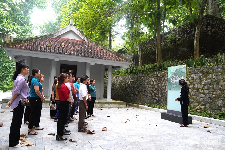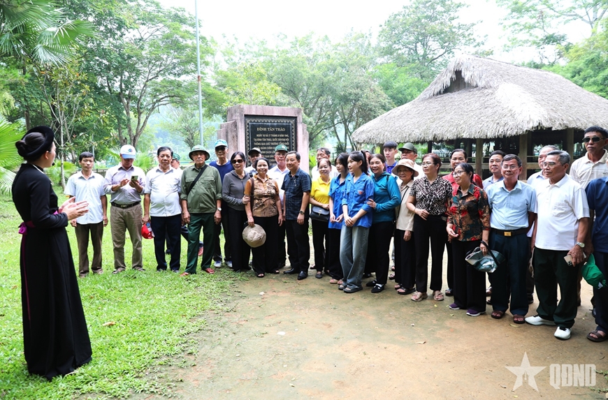 | Đoàn khách về nguồn, tìm hiểu dấu ấn Cách mạng Tháng Tám năm 1945 tại Đình Tân Trào. |