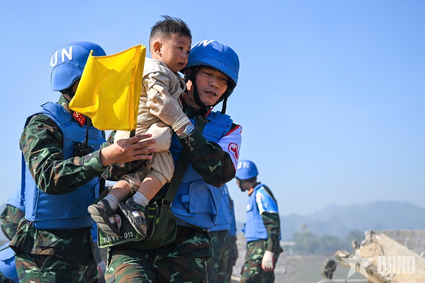 Trong tình huống giả định đầu tiên, Đội Công binh nhận nhiệm vụ khảo sát, rà tìm bom, mìn, vật liệu nổ tại khu vực gần doanh trại đóng quân của đội – nơi dự kiến Quỹ Nhi đồng Liên hợp quốc (UNICEF) sẽ hỗ trợ chính quyền và người dân địa phương xây dựng trường học.