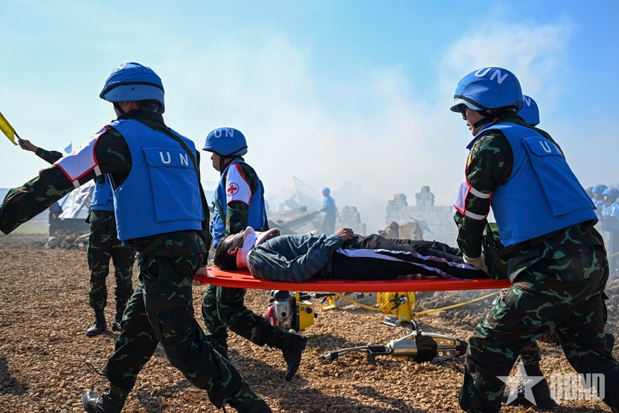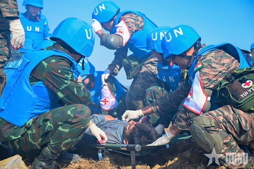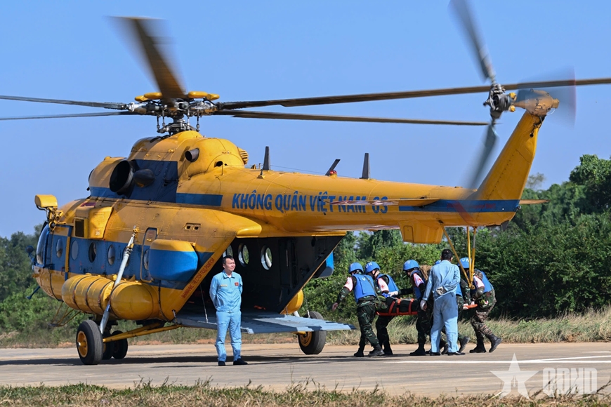 Bước sang tình huống thứ ba, Đội Công binh phối hợp cùng các lực lượng khác tiến hành cứu trợ nạn nhân do động đất, sập đổ công trình, tham gia cấp cứu và vận chuyển y tế đường không. Đây là tình huống đòi hỏi có sự phối hợp, hiệp đồng nhuần nhuyễn, đảm bảo chuyên môn cao. Bối cảnh tình huống là sau khi xuất hiện trận động đất 6 độ richter, nhiều vị trí trong doanh trại đóng quân bị rung lắc. Người đứng đầu chính quyền địa phương cho biết, Bệnh viện do UNICEF hỗ trợ xây dựng bị sập, đổ, bên trong có một số nạn nhân bị kẹt lại.