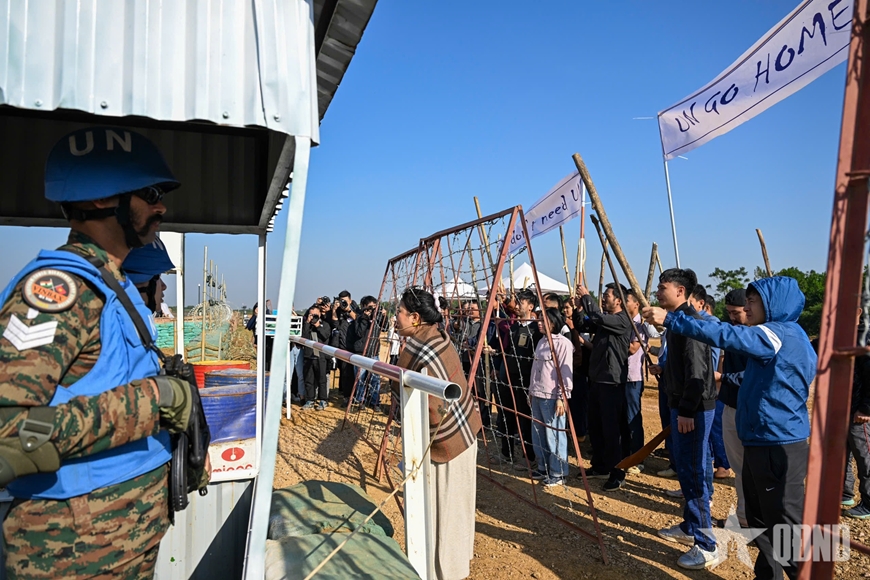 | Nhóm người tụ tập bên ngoài la hét, đòi gặp chỉ huy của Đội Công binh để khiếu kiện về việc quấy rối và bạo lực tình dục với một phụ nữ của nhóm người trên. |