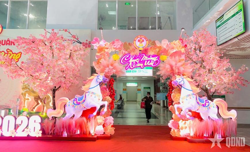 Ngay từ sảnh chính, không khí Tết đã rộn ràng với mô hình tiểu cảnh được đầu tư công phu. Hình ảnh đôi ngựa trắng dũng mãnh vươn mình, những gốc hoa đào hồng thắm khoe sắc cùng biểu tượng số 2026 rực rỡ. Tại các khu vực chờ khám bệnh, bảng chữ "Chúc mừng năm mới" và những nhành mai vàng được bố trí khéo léo, giúp giải tỏa áp lực tâm lý cho người bệnh ngay từ khi bước chân vào bệnh viện.