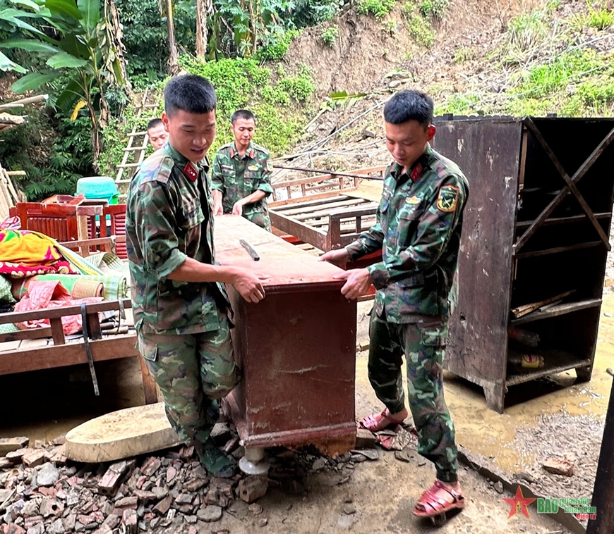 Bộ đội Quân khu 2 giúp người dân di chuyển những ngôi nhà có nguy cơ sạt lở ra khỏi vùng nguy hiểm. |